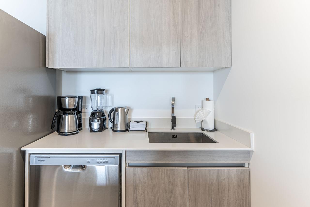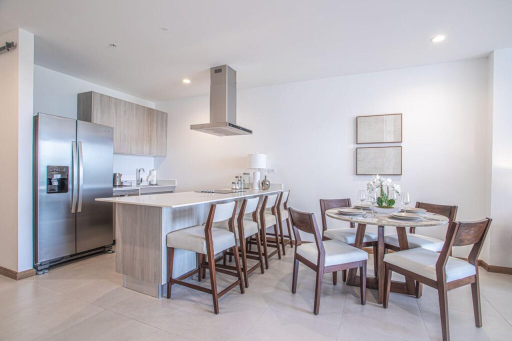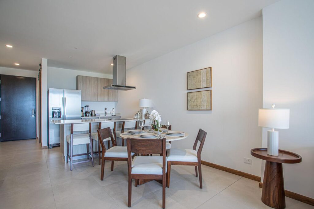 The unit features an open-concept living and dining area with floor-to-ceiling windows that capture breathtaking Pacific sunsets. A private balcony provides the perfect setting to relax or entertain while enjoying the ocean breeze.